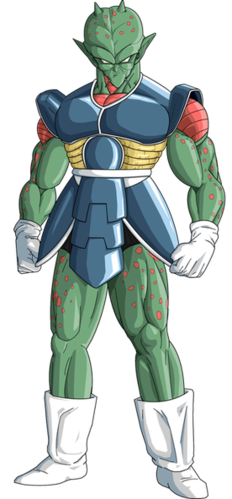 Tiene una armadura de color azul oscuro con lineas blancas y en los costados es de color marrón, unos guantes y botas blancos como los del traje de pelea de los Saiyajins .