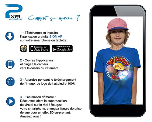 Camiseta 3D animada DRAGON WAR aplicación gratuita. ¡Descubre la realidad aumentada! Descarga la aplicación SION AR gratis. Abra la aplicación, coloque el teléfono inteligente frente a la camisa y vea la animación 3D correspondiente. Compatible con todas las marcas de teléfonos inteligentes y tabletas! (Iphone, Ipad, HTC, LG, Samsung, Sony, Huawei, Asus, Wiko, etc.) Necesitas un teléfono inteligente con sistemas de Internet 3G, 4G o WiFi en Apple iOS 4.3 o posterior y Android 2.3 o superior que funcione. Camiseta a la moda. Camiseta 140gr / M2 – 100% algodón peinado. Cuello redondo. Costuras laterales. Lavar 30 ° en la parte posterior. Hierro en el reverso. Sin secadora. Camiseta animada en 3D en realtà aumentata.