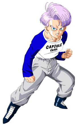 Apariencia : Trunks del Futuro tiene el pelo largo hasta las orejas, y es de color lila. También lleva una chaqueta de color morado con el logo de la Corporación Cápsula , con un cinturón amarillo con algunos detalles de color azul, blanco y rojo. Lleva una camiseta de tirantas de color negro por debajo de su chaqueta y unos pantalones también de color negro. En la espalda guarda su espada. Tiene unas botas de color amarillo y marrón con detalles cuadrados.
